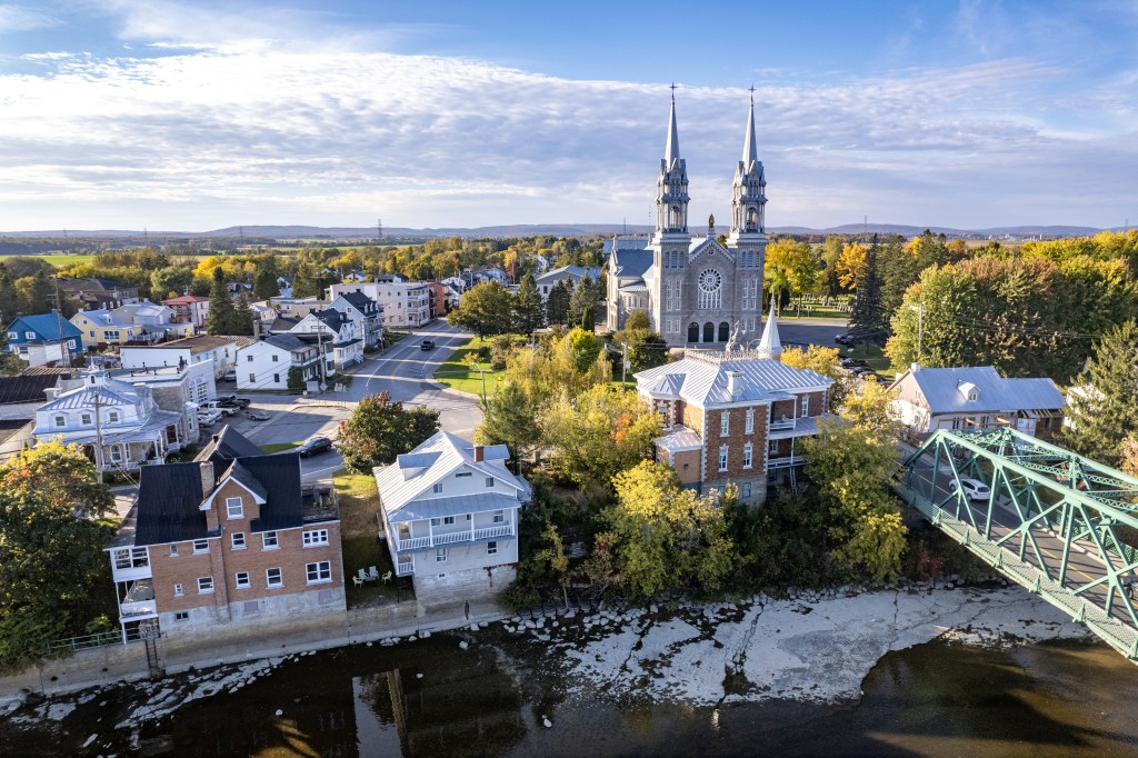 C’est un peu l’image du parfait village québécois. Le pont en treillis vert de Saint-Casimir, passant au-dessus de la rivière Sainte-Anne, aboutit directement face l’église. Le village est adossé à la rivière, avec ses belles résidences en brique et ses toitures métalliques.
